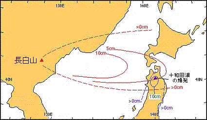 長白山とほぼ同じ緯度にある日本の青森県から北海道にかけ、当時の地層に見られる火山灰層から、
