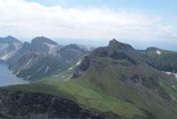 この峰は氷河に削られて出来たものです。頂上から北に天池の方へと伸びた尾根は壮観で、向かい側の
