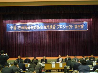 [経済] 延辺州政府、日本で投資説明会を開催 参考リンク: 投資説明会の概要報告 4月20日(木)、大阪市の在日本大韓民国民団大阪府地方本部の5Fホールで、延辺州人民政府が日本で開催する 初めての投資誘致説明会が行われました。延辺側からは州政府のみならず延吉市・図們市・汪清県などの要人、 外事関係者10数名が臨席、在日コリアン・日本人の企業家を中心に50名ほどが出席する中、延辺での 新しい事業展開の可能性につき、熱意あふれる説明が続きました。 ▲ 高傑副州長(右)、朱哲洙商務局長(左)ら主催者側一行が到着。 ▲ 開会に先立ち、民団大阪幹部の方々を表敬しました。 ▲ 14時、大ホールにて投資プロジェクト説明会が始まりました。 ▲ 高傑副州長よりのご挨拶。 ▲ アジア経済機構・堀美喜雄理事長(共催:右端)、異業種交流会BIN・池田浩代表(後援:中央)。 ▲ 州人民政府・朱哲洙商務局長による投資環境の説明。 ▲ 駆けつけた民団大阪・金漢翊団長に、高傑副州長から感謝杯の贈呈がありました。 ▲ 「まずは延辺を見にいらして下さい。これからがベストシーズンです。」 アジア経済機構延辺支部長・齊藤靖氏から、視察ツアーのご案内。 ▲ 説明会終了後、商談会へと続きました。延吉市・趙哲学市長(左から二人目)も応対。 (朝鮮族ネット 2006年4月21日)