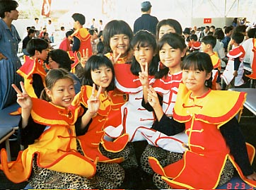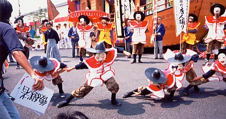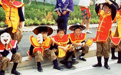 ■唐人踊りを継ぐ会「子ども唐人」 衣装などの道具類の多くは、唐人踊保存会員らによる手作り。最初の年にできあがった43個の仮面は、 当時の谷口茂樹校長が校長室で、製作に励んだといいます。これまで、「子ども唐人」の会員は累計300人程になりました。 97年の津まつりでは、子ども唐人の卒業生が高校生になり、大人に交じって本番に参加するなど、 後継者としての活躍が期待されています。 子ども唐人での出演する機会も多く、 地区の敬老会など毎年のように楽しみにしてもらっているところもあります。「大人よりもぜひ子ども唐人を」との希望もあります。 また、近くの中央保育園には、古くなった子ども唐人の衣装を譲り、 他の郷土芸能とともに親しむ機会にしてもらっています。 |