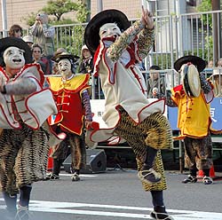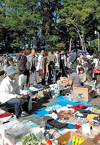 | ★歴史紡ぐ列 唐人おどり★ 開催2日目の8日、「津まつり」の盛り上がりは最高潮に達した。大パレードには、同市の伝統芸能「しゃご馬」や江戸時代に朝鮮通信使が伝えたとされる「唐人おどり」=写真=も登場し、約370年前が起源という祭りを彩った。 ★準備実り盛況 フリーマーケット★ 同じお城公園の125区画でフリーマーケットも開かれた=写真。 市民ボランティアなどでつくる実行委員会が25年前から続けてきた。さまざまな障害者支援団体の資金工面の機会にもなっている。会場を取り仕切る萩野茂樹さんは、「全体の裏方を兼ねている出店者もいて、運営は手作り。今年もにぎやかになってよかった」。 ★68点うっとり 青空写真展★ お城公園の一角では、全日本写真連盟だいこん支部による青空写真展が開かれた。感性豊かな68枚が、木々の間で風に揺らめいた。 木と木の間に通した鉄線に大判写真を下げた。しぶきを上げて跳ねるイルカを写した千葉勇夫さんの「ジャンプ」を前に、通りがかった男性は「いい写真やね」と、しばしうっとりしていた。 ★PRにいい機会★ 一方、3年以内に始まる裁判員制度を多くの人に知ってもらおうと、津地検の検事らも、「裁判員制度ひろめ隊」と称し津まつりに参加した。 参加した約20人は、「裁判員制度」と書かれた青と赤の法被を身につけ、のぼりを立てながら踊った。 (平成18年10月10日 朝日新聞) |